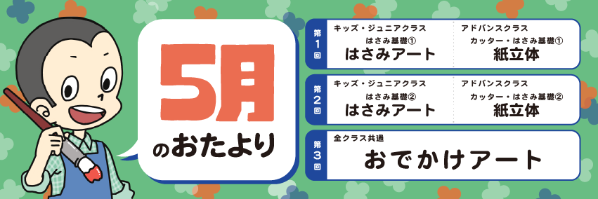 今月の予定こども造形表現教室 2026年5月のおたよりが出来ました! 今年もおでかけアートで屋外の散策に行きます!行ったこと見たことある場所でも、見方をかえると新たな発見につながります。道具の確認と準備をお願いします。